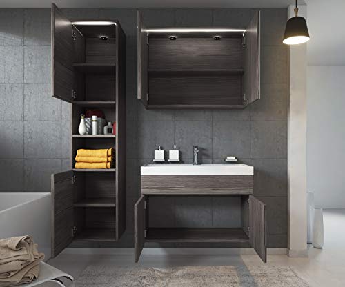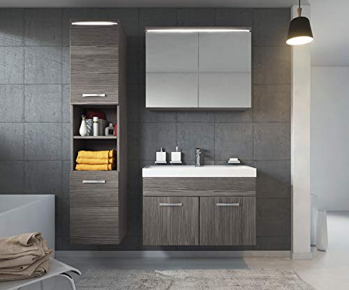 Badkamermeubel set Paso inclusief, wastafel en spiegelkast en kolomkast. Vanwege zijn strakke afwerking is het meubel gemakkelijk schoon te maken. De set is uitgevoerd in grijs eiken en is gemakkelijk te monteren. De spiegelkast en de zijkast zijn uitgevoerd met LED verlichting.