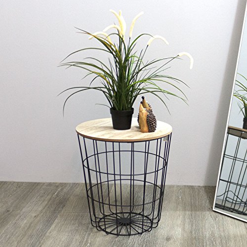 Deze decoratieve bijzettafel bestaat uit een zwart gecoate metalen mand en een afneembaar houten tafelblad.