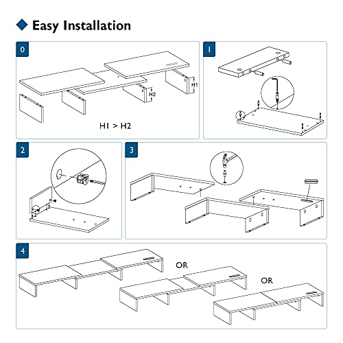 Eenvoudig te monteren: Montage kan binnen 3 minuten plaatsvinden. Gewoon de vloer met schroeven monteren en de 2 zijpanelen aan het middengedeelte monteren. De onderkant van de dubbele monitorstandaard kan wegglijden voorkomen en tegelijkertijd elk oppervlak tegen krassen beschermen