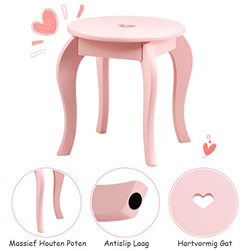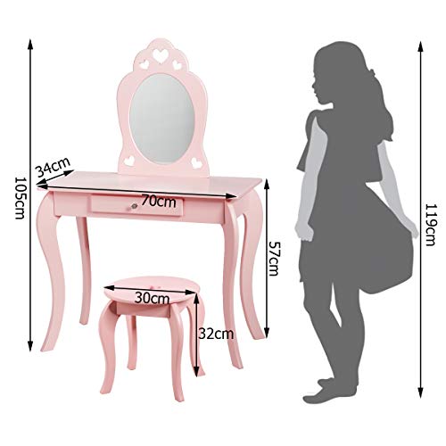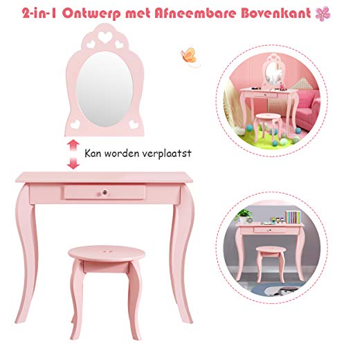 COSTWAY Kinderen kaptafel en stoel set, prinses make-up kaptafel met lade en spiegel, 2-in-1 make-up tafel set met…