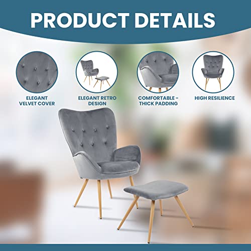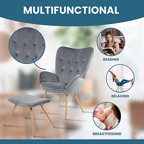 De Albatros-oorfauteuil met YORK-kruk, grijs, fluwelen hoes, comfortabel gestoffeerd, tv-fauteuil, gestoffeerde fauteuil