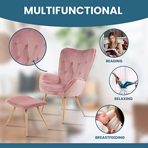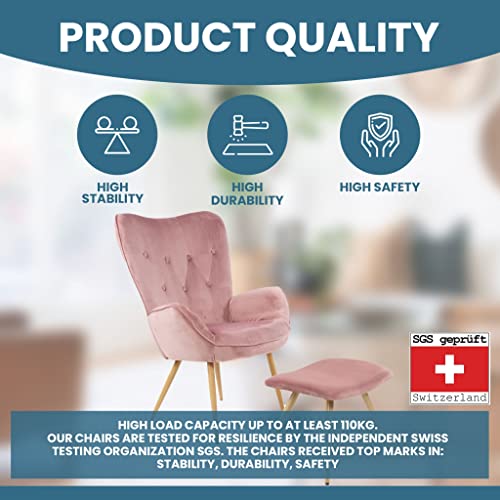 Specification: De Albatros-oorfauteuil met YORK-kruk, roze, fluwelen hoes, comfortabel gestoffeerd, tv-fauteuil, gestoffeerde fauteuil