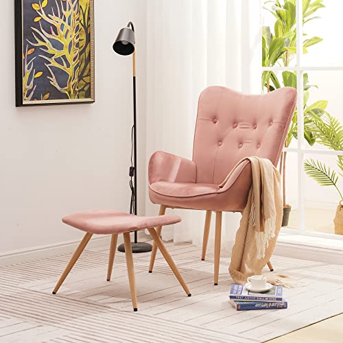 De Albatros-oorfauteuil met YORK-kruk, roze, fluwelen hoes, comfortabel gestoffeerd, tv-fauteuil, gestoffeerde fauteuil
