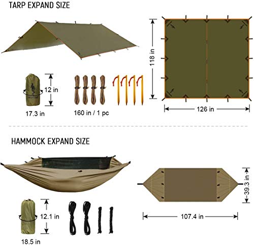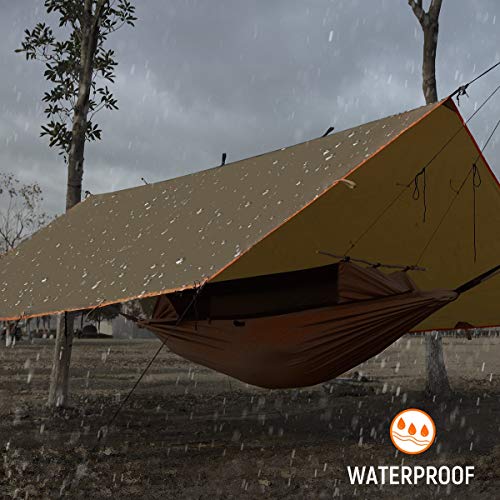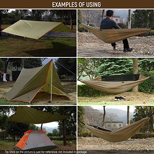 Gemakkelijk te gebruiken – deze draagbare set van hangmat en zeil definieert de camping nieuw. We hoeven alleen de hangmat en het regenvliegzeil in de kleine aanhangende zak te stoppen, in de rugzak te steken en klaar is Kees. Als je de beste campingplaats hebt gevonden, is de installatie zelfs voor beginners snel en uiterst eenvoudig. De verpakkingsmaten bedragen 44 x 35 cm (regenvliegtentzeil) of 35 x 47 cm (hangmat). Hij is ultralicht en klein en perfect voor kamperen, backpacking.