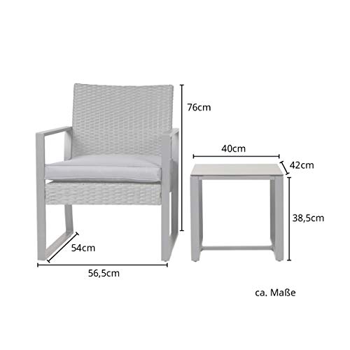 1 x tafel met glasplaat: ca. 40 x 35,8 x 42 cm (b x h x d) – 2 x afzonderlijke stoel incl. kussen: ca. 56,5 x 76 x 54 cm (b x h x d). Zitting incl. kussen: ca. 37 x 52 cm (h x d).