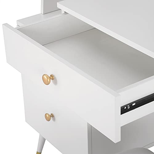 Praktisch en mooi: wordt geleverd met een make-upspiegel en een make-upkruk. De spiegel is helder en helder en heeft een diameter van 40 cm. De stoel is zacht gevoerd, de metalen poten zijn robuust en stabiel. Dit alles creëert een comfortabele make-uphoek voor jou. De witte uitvoering en de gouden accenten onderstrepen de stijlvolle en elegante stijl van de kaptafel en geven je slaapkamer een andere sfeer